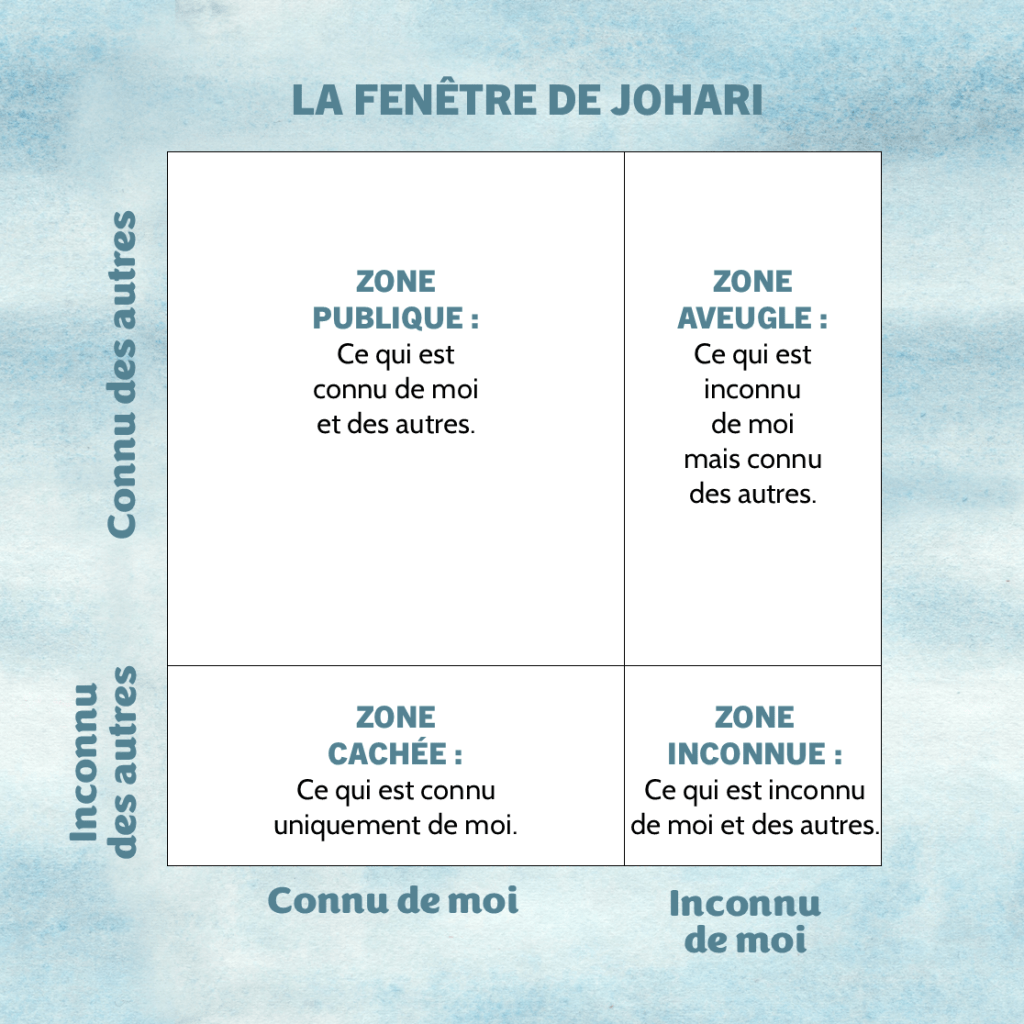 Inspirée de la PNL, la Fenêtre de Johari est une méthode de représentation de la communication entre deux entités, c’est-à-dire dans le cadre du développement personnel, entre soi-même et les autres. C’est un outil qui nous permet à la fois de mieux nous connaitre mais également de mieux comprendre l’image que nous renvoyons aux autres.