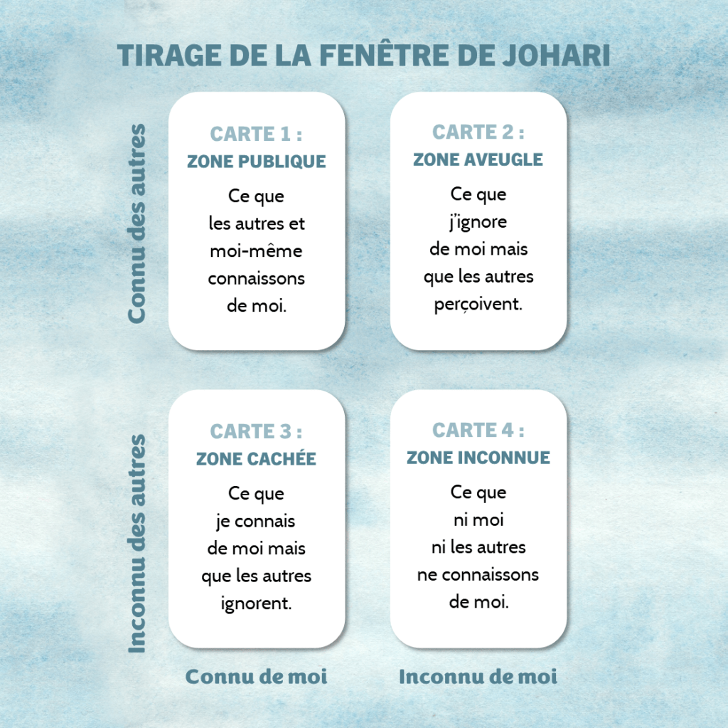 Il m’a semblé intéressant d’essayer d’envisager cette fenêtre avec le tarot pour associer les informations données par la Fenêtre de Johari et celles révélées par les arcanes.